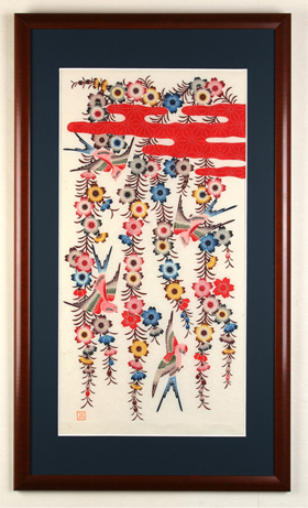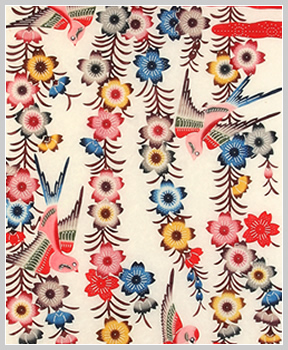 Washi paper dyed with a classical Bingata design of swallows and sakura (cherry blossoms).