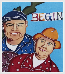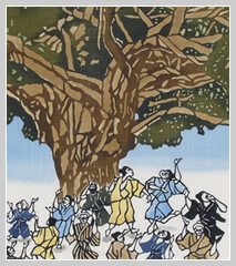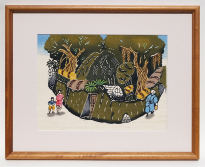 This piece is based on a story depicting a beautiful girl who lived near Shuri castle . She had a brother who turned into an ogre , and caused much trouble to the villagers. The sister thought that she was the only one who could stop her brother. One day in December, she called her brother up to a hill where many Akagi trees grew. This hill was south of Shuri Castle, near the stone road in Kinjo Town. She brought rice cakes made from rice for her and rice cakes made from iron for her brother. She ate the rice cakes easily, but the rice cakes were too hard to eat for her brother. He looked up at his sister, who was sitting on a high branch of an Akagi tree with her kimono half open. He asked her, “How come you can eat this rice cake so easily? And, why does it look like you have two mouths?” Smiling, she answered, “The top mouth is for eating muucii (rice cakes), and the bottom one is for eating ogres!” Her ogre brother was astonished and stepped back. He fell from the cliff and died. This is a well-known scene from Ryukyu folk tales. Muucii are rice cakes covered with San’nin leaf (Japanese: Gettou; English: Shell Ginger). Each house makes muucii from mochi rice powder on December 8th of the lunar calendar and eats it with hope for the good health of family members.