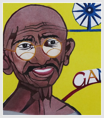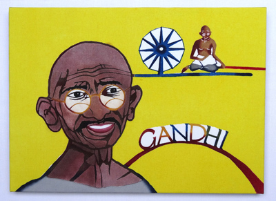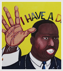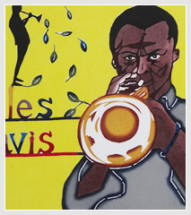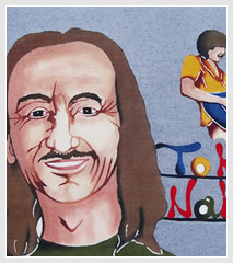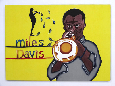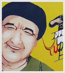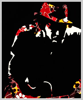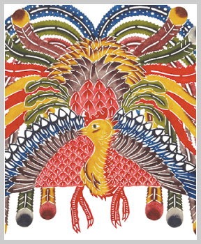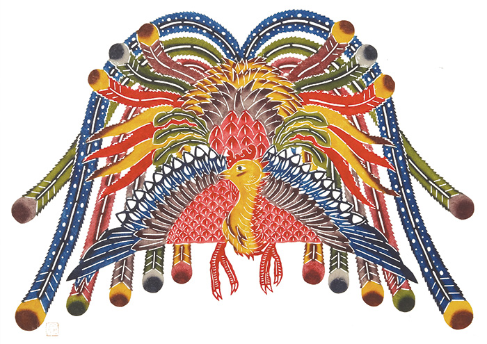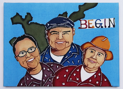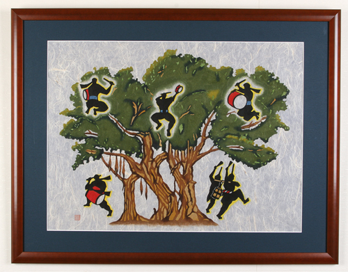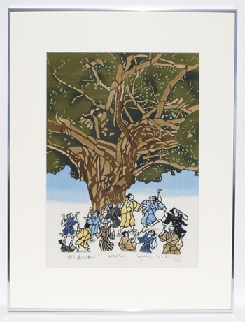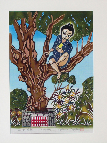 It is said that spirits live in gajumaru (banyan) trees. The young man dancing Eisa in this piece symbolizes the spirits in the tree.