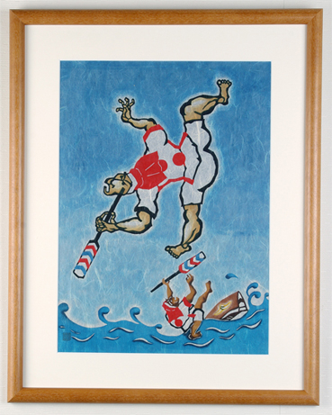 Ha-re (Ha-ri, dragon boat race) is an event where people express thanks for the bounty of the ocean and pray for safe voyages and an even bigger catch. It is held at many fishing ports in Okinawa on May 4th of the lunar calendar. This piece depicts the most famous ha-re, the kun’nukase (overturning boat race), which is held in the Itoman area. When the race starts, all paddlers jump into the water and turn over their small boat (sabini). Then, they turn the boat back over, get back into it, and continue to paddle to the goal while bailing out the water. You can sometimes see boats tip over when the crew is not good at bailing out the water.