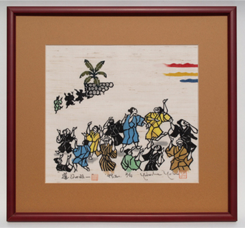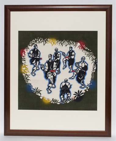 The biggest event in Okinawa is Eisa. Eisa is a centuries-old tradition, unique to Okinawan culture. It is a type of folk dance accompanied by singing, chanting, and drumming. It is held for three consecutive days, July 13-15th of the lunar calendar, to pay respect to the ancestors and mark the end of the Obon season. On the last day, ukui, Eisa is performed after the people see off their ancestors. This piece depicts Eisa that originated in the Heshikiya area on Central Okinawa’s Katsuren Peninsula.