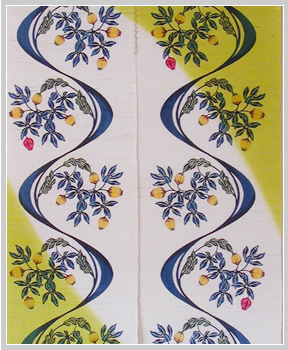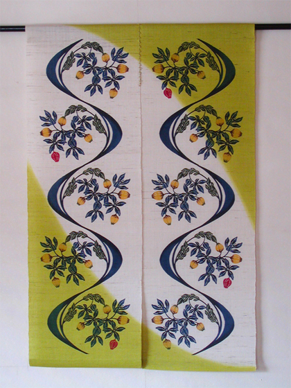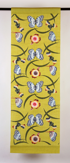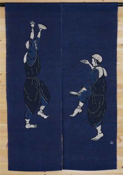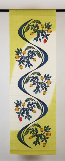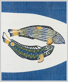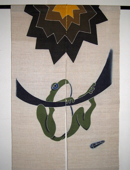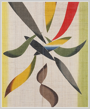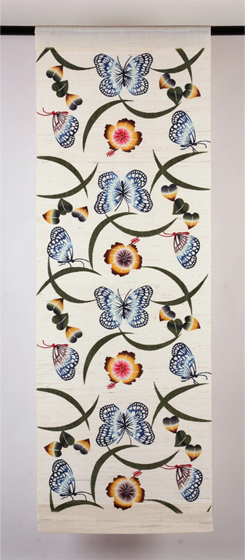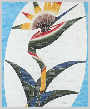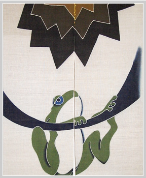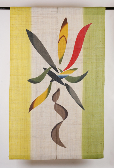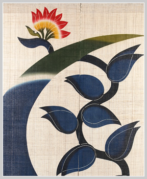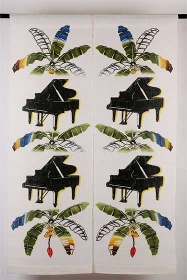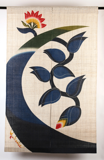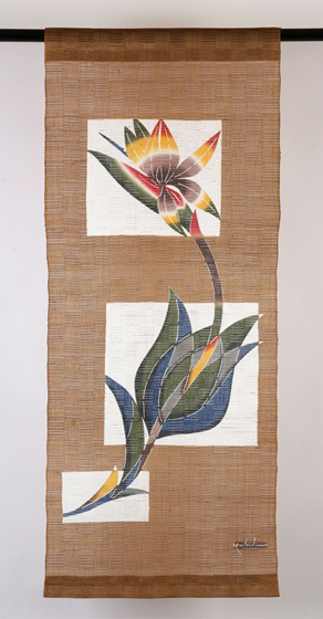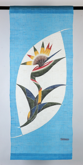 This katazome-dyed noren (tapestry) was made from a one-stroke drawing of bird of paradise flowers, and heliconias—flowers that bloom in Okinawa during the summer.