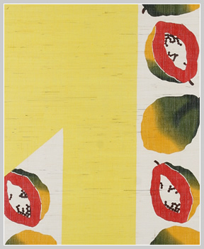 This piece features the tropical papaya fruit. Okinawan people eat green papaya stir-fried like a vegetable. But, I prefer well-ripened orange papaya. I tried to make this piece so that the image appears even more delicious than real papayas. If you plant the black-brown seeds, they sprout quickly and grow fast.
