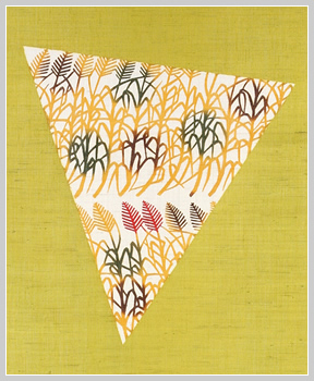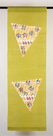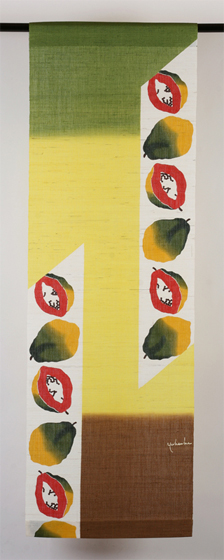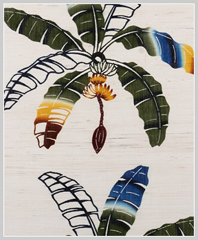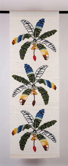 Basho is Okinawan for banana tree. This piece depicts a banana tree that grows in my garden. It has borne many bananas. We pick the bananas before they ripen—when they are still green and hard, like in this tapestry. Also, its huge leaves come in many interesting shapes that make for perfect kitchen decorations.